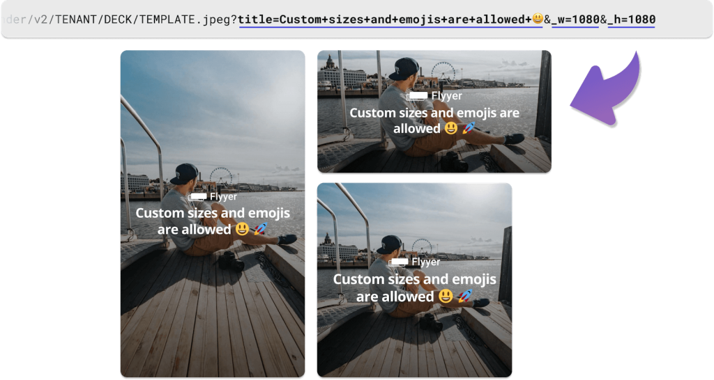 Try it by your self: https://cdn.flyyer.com/render/v2/flyyer/default/main.jpeg?title=awesome!+😃&description=Optional+description&_w=1080&_h=1920